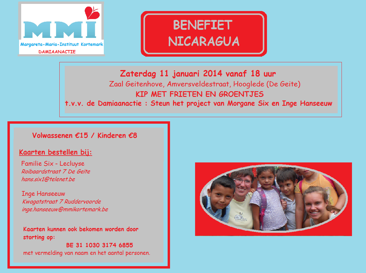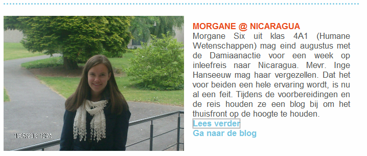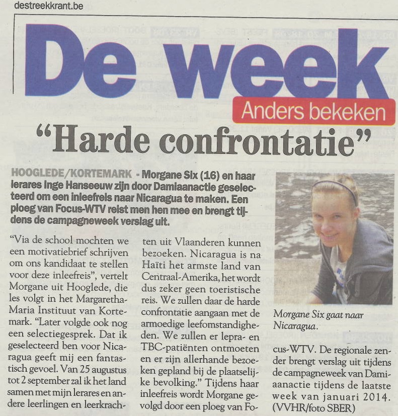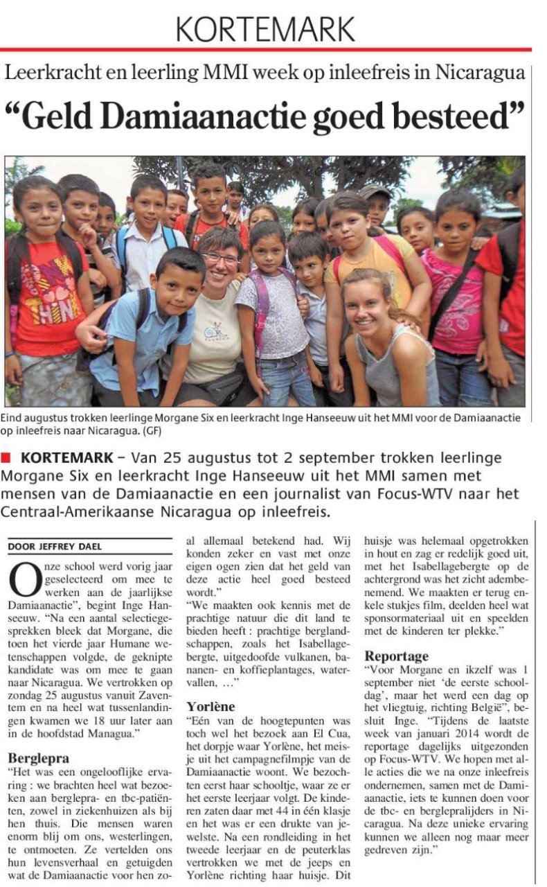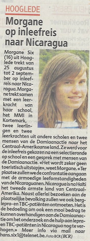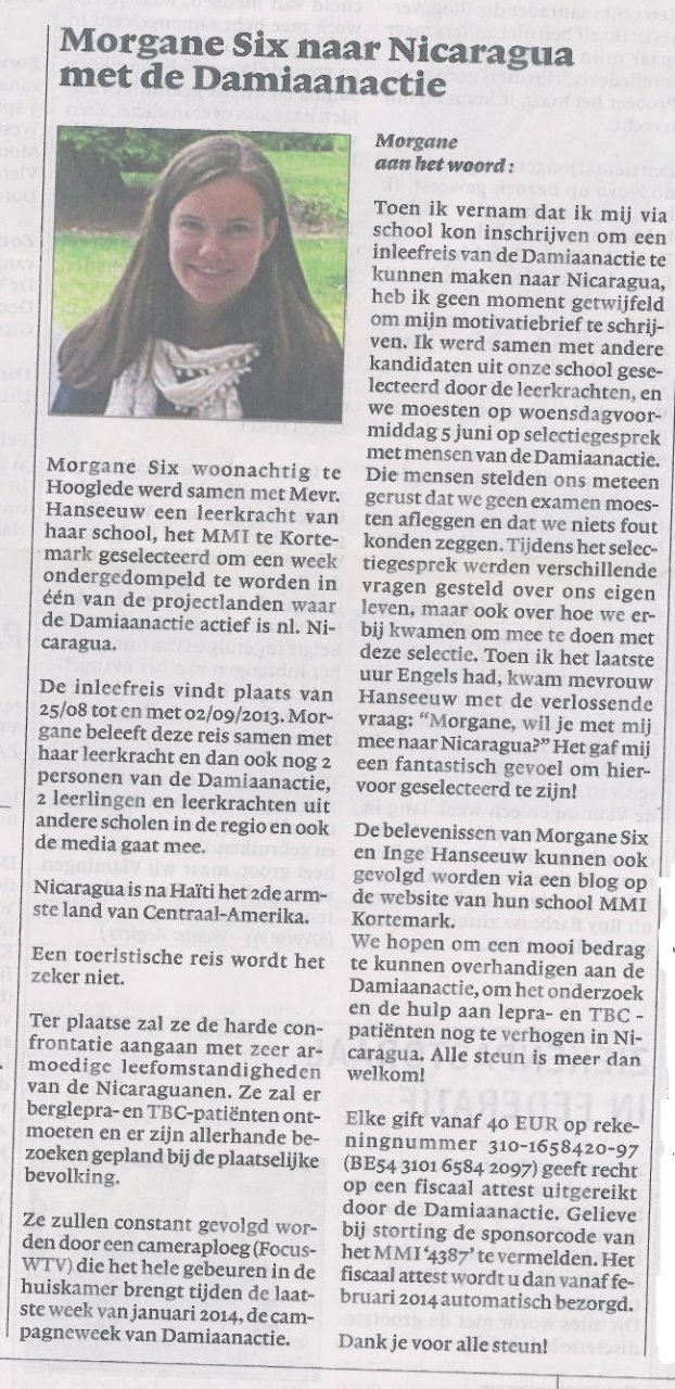 Inge Hanseeuw : “De reis gaat door van 25 augustus tot en met 2 september. Het is de bedoeling dat we samen met twee andere West-Vlaamse scholen uit Kuurne en Menen ambassadeurs worden van de Damiaanactie en ons hiervoor blijven inzetten. Ikzelf ben vorig jaar een hele maand naar Bangladesh geweest en heb de microbe meer dan te pakken om me voor de lepra- en TBC-patiënten in te zetten. Voor het schooljaar 2013-2014 is onze school geselecteerd door de Damiaanactie om mee te werken aan de jaarlijkse campagne. Dit betekent dat één leerling uit het vierde jaar en één leerkracht gedurende een week ondergedompeld worden in één van de projectlanden waar de Damiaanactie actief is. Voor onze school concreet gaat het om Nicaragua, gelegen in Centraal-Amerika. Het klinkt als een leuk reisje, maar dat is het zeker niet. Ter plaatse moeten we de harde confrontatie aangaan met de zeer armoedige leefomstandigheden van de Nicaraguanen. We zullen er lepra- en TBC-patiënten ontmoeten en er zijn allerhande bezoeken gepland bij de plaatselijke bevolking. Verder worden we constant gevolgd door een cameraploeg die het hele gebeuren in de huiskamer brengt tijdens de laatste week van januari 2014, de campagneweek van Damiaanactie. Er waren een tiental geïnteresseerde leerlingen die hun motivatie kenbaar maakten. Uiteindelijk werd het Morgane Six uit klas 4A1 die na de selectiegesprekken met vertegenwoordigers van de Damiaanactie de beste kandidaat bleek om een weekje naar Nicaragua te trekken. Morgane en de andere geïnteresseerde leerlingen zullen de campagne trekken op onze school”. Meer info over de inleefreis is te vinden opstaat op https://mmi-gaat-naar-nicaragua.webnode.nl/.